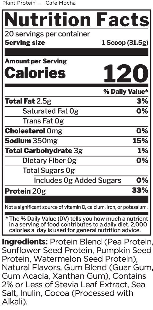 Mixing Directions Drop one (1) heaping scoop of Plant Protein™ into 8-10 oz. of water, plant milk, or fruit juice in a shaker cup or large glass. Shake or stir it up!