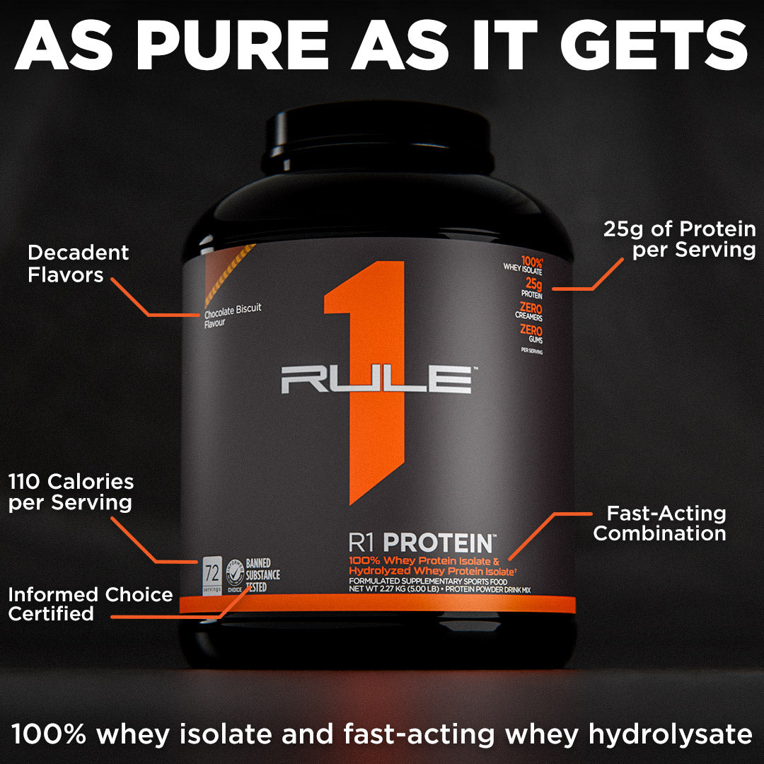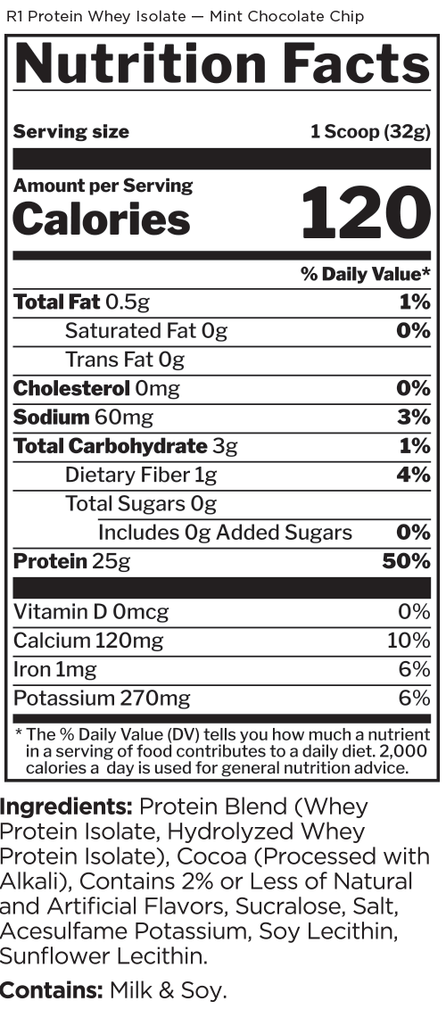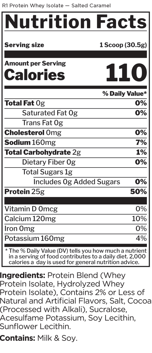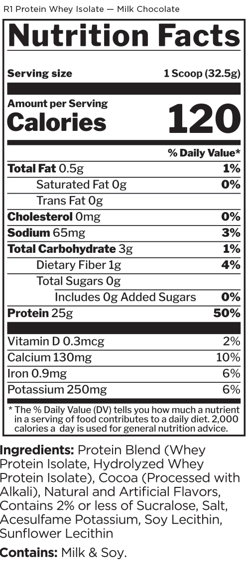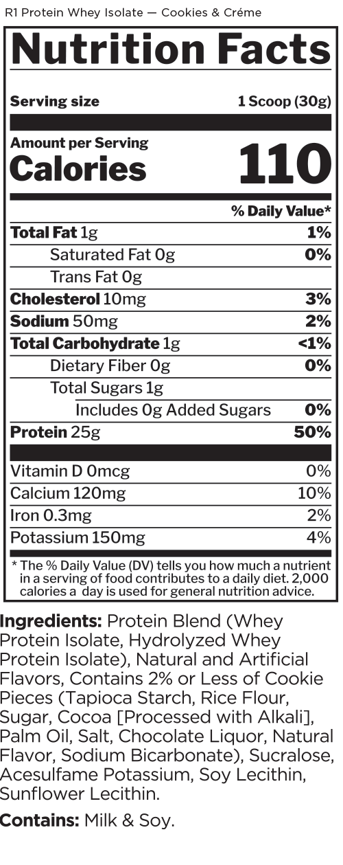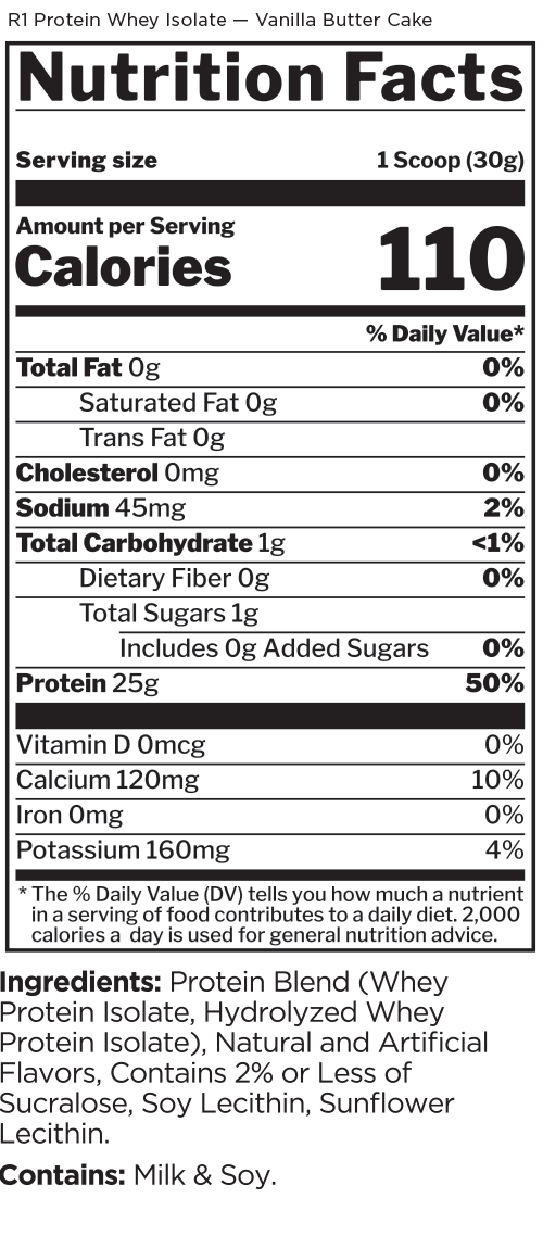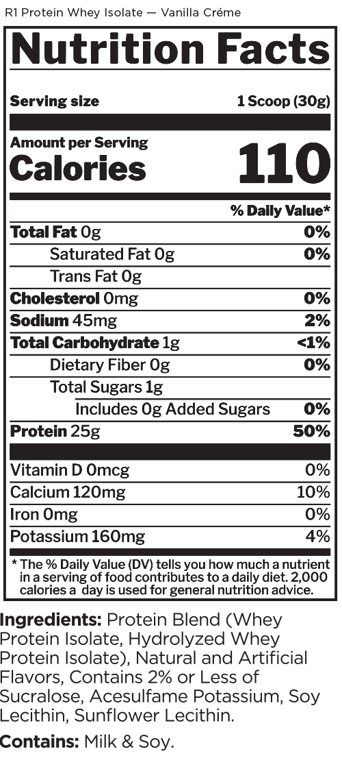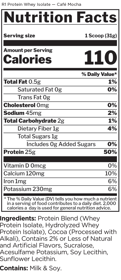 This protein formula is as pure as it gets. With 25g of protein and over 6g of BCAAs — entirely from intact and hydrolyzed whey protein isolates — R1 Protein helps support the recovery and growth aspirations of the most ardent muscle builders.