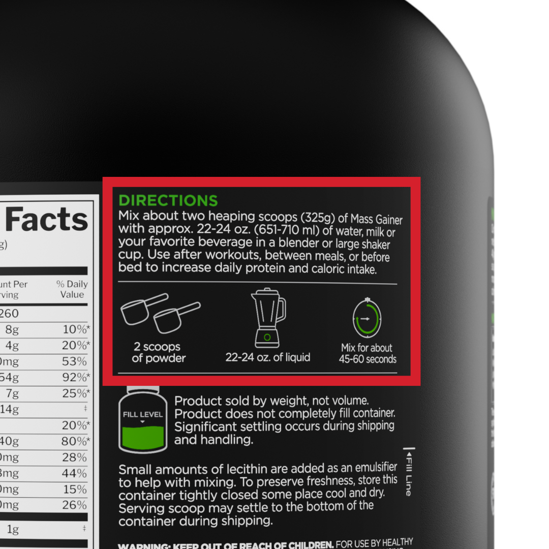 Add two (2) heaping scoops of Mass Gainer with 20-24 oz. of water, or milk, in a shaker cup or blender and mix it up!
