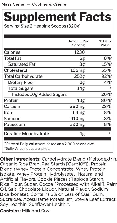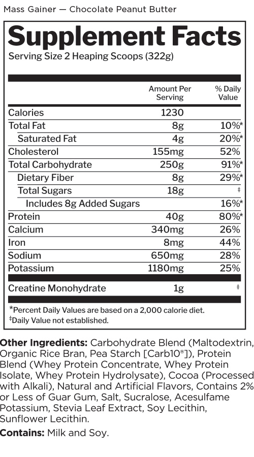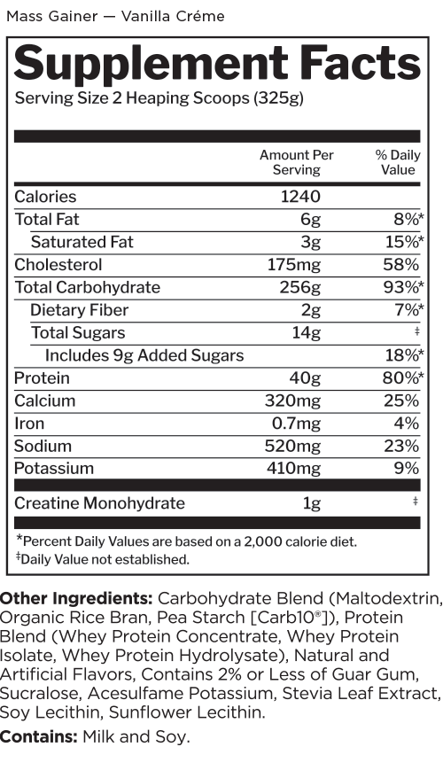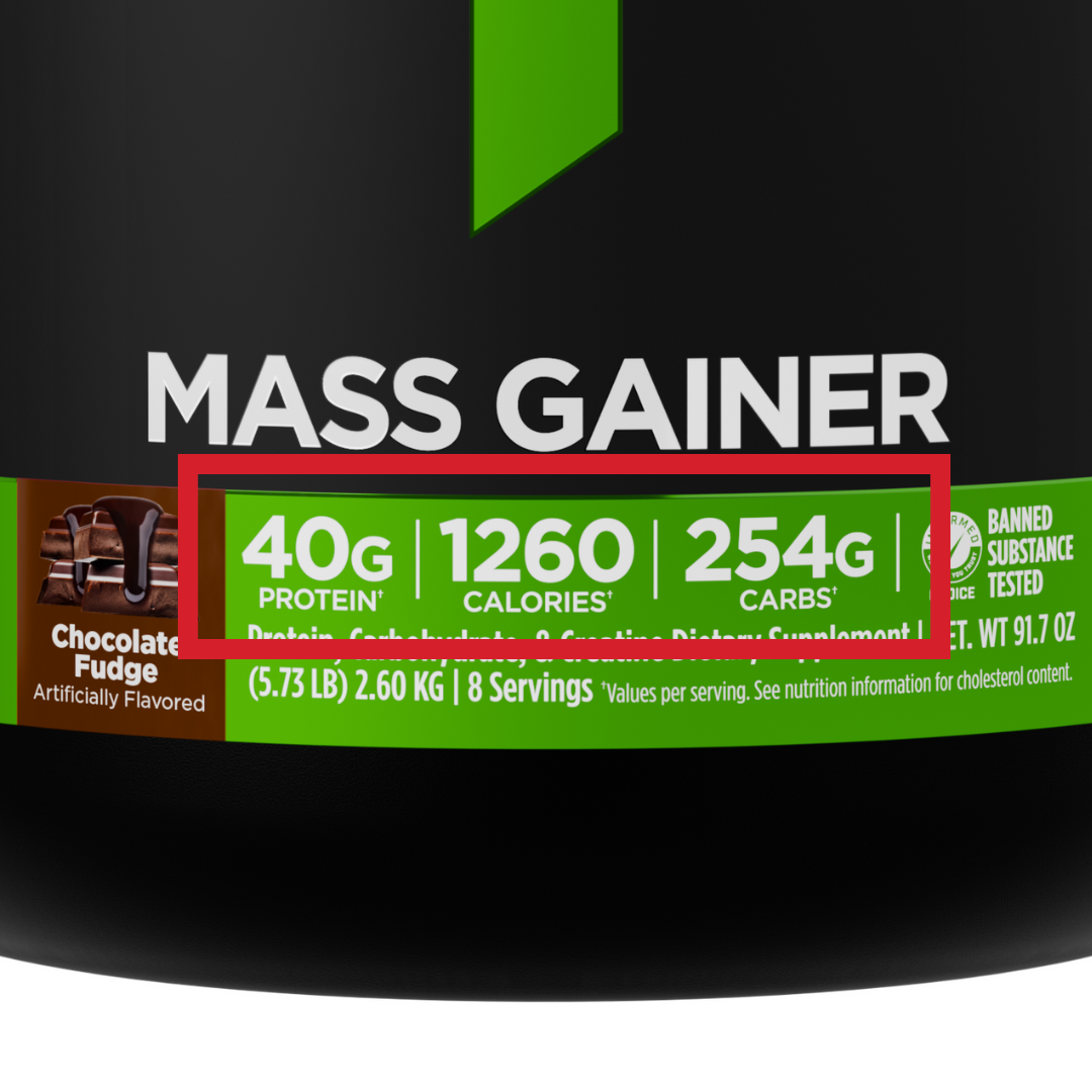 With over 1,220 calories, more than 250g carbohydrates, and 40g protein from three types of whey, Mass Gainer puts you in charge of transforming to XXL. The 6:1 carb-to-protein ratio in this calorie-packed formula can help you pack on desired pounds.