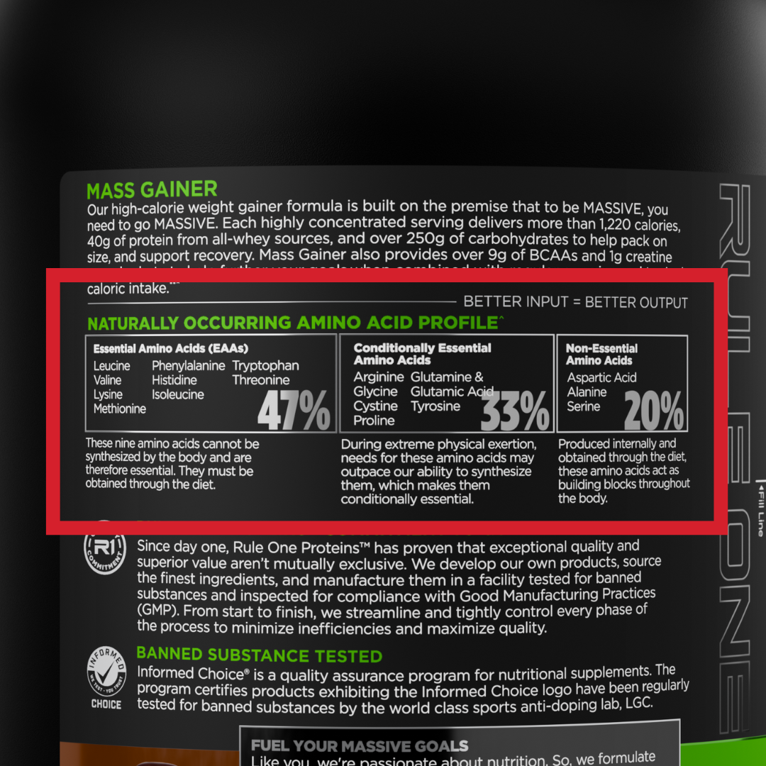 Rule 1’s Mass Gainer uses quality ingredients — no cheap fillers, no added sugars, no low-grade oils. You get clean carbs, premium whey protein, and healthy fats to fuel growth, without the junk.