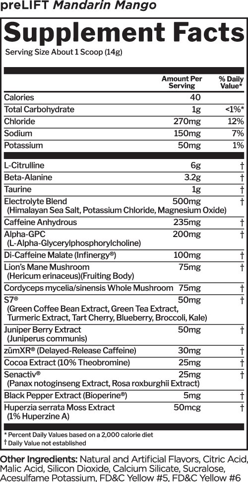 Unit price / perWe loaded preLIFT™ with 25 different active ingredients including 5 licensed/patented compounds, designed to help serious lifters prepare and ultimately prevail over any training challenge. Each serving supports mental alertness, muscle endurance, and lasting energy. It’s the complete pre-workout preparation package.^