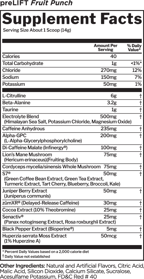 We loaded preLIFT™ with 25 different active ingredients including 5 licensed/patented compounds, designed to help serious lifters prepare and ultimately prevail over any training challenge. Each serving supports mental alertness, muscle endurance, and lasting energy. It’s the complete pre-workout preparation package.^