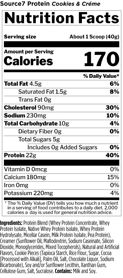 Source7 Protein brings together seven premium proteins, decadent flavor, and velvety smooth texture in an easy-to-mix shake. Its exceptionally great taste - inspired by creamy gelato - is complemented by 22g of protein from a blend of faster, moderate, and slower digesting sources.
